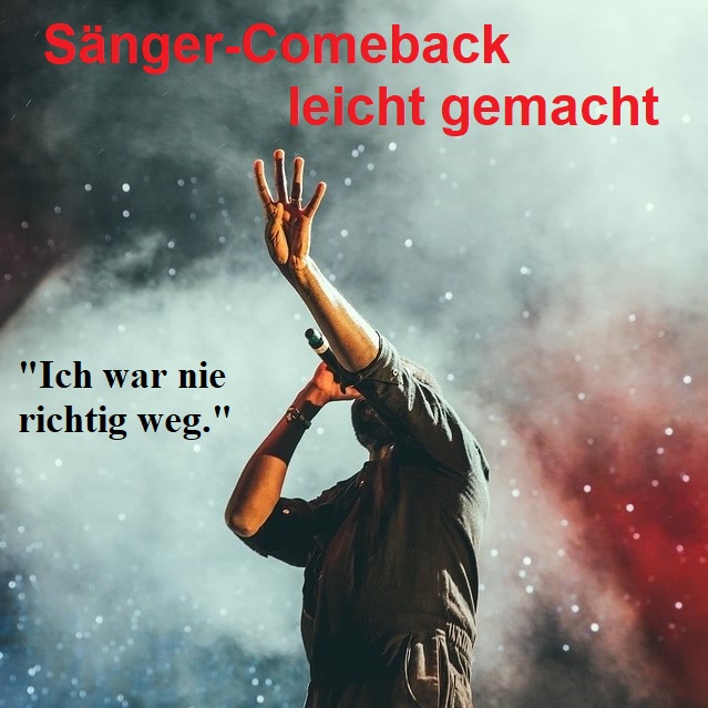 Sie sind Sänger. Mit Ihrer Karriere ging es zuletzt kontinuierlich bergab. Jedes Album verkaufte sich schlechter als das vorhergehende. Konzerthallen waren schon lange nicht mehr zu füllen. Nach einer mehrjährigen – natürlich sagen Sie in den Medien „kreativen“ – Pause, hat sich doch noch ein Musikproduzent erbarmt, ein Album mit Ihnen aufzunehmen. Und jetzt sitzen Sie in einem Interview, in dem Sie über Ihr Comeback reden sollen. Nur ein paar Standardsätze auswendig lernen – und schon meistern Sie das Interview bravourös! Die Standardsätze für Ihr Sänger-Comeback lauten (in Klammern darunter der wahre Sachverhalt):